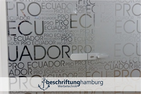 Die Montage der Glasdekorfolie erfolgt direkt bei Kunden und verleiht der Durchgangstür einen edlen Sandstrahl-Look. Der Vorteil von Milchglassichtschutzfolie gegenüber gesandstrahlten Glasscheiben ist die leichte Entfernbarkeit bei Firmen- oder Logowechsel.